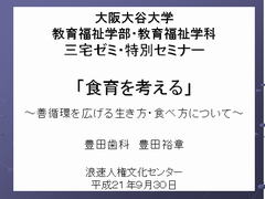 平成21年9月30日(水)、大阪大谷大学教育福祉学部・教育福祉学科4回生三宅ゼミの5名の学生さんが、卒論のテーマに食育も対象とされているとのことで研修に来られたので、医院近くの浪速人権文化センター会議室で、私的にミニ特別セミナーを開講しました。 卒業を控え、勉学に励んでいるやる気のある学生の方々と交流ができ、刺激的で楽しく、有意義な時間を過ごせました。また、たくさんの気づきもいただき、今後の私の活動にも、とてもプラスになりました。 熱心に私のつたない話を聞いてくださった学生の皆さん、有難うございました。 卒論の仕上げ頑張ってくださいね。そして、教師になる夢の実現めざして頑張ってください。心より応援しています! 今回のご縁をいただきました、教育福祉学科教授三宅奎介先生、まことに有難うございました。三宅先生には、過去に、大阪府・大阪市・堺市栄養教諭「教職入門セミナー」において、講義をする機会もご提供いただき、今回も貴重な体験をさせていただき、心より感謝しています。 講義の趣旨は、次の記事を参照いただければと思います。 「はじめよう!広げよう!食育・食生活指導」 「地産地消」より「土産土法」こそ食べ方の原点である 以下、学生の皆さんからいただいた感想・質問です。 ************************ ■宮治美紀さん 先日は貴重なお時間を割いてお話をしてくださりほんとうにありがとうございました。 卒業論文を書く上だけでなく日常生活にも通じることも多く非常に興味深く聞かせていただき心に残っております。 面倒なことをすることで健康になる。このことは私の日常生活にも深く響き反省もしました。 便利は損だということに気づき改めて自分の考え方や生活も見直そうと思いました。 食生活に関しては我が家はほとんど和食がメインです。 幼いときは不満を口にしていましたが今考えると感謝しています。 子供たちに否定的に伝えるのではなく、肯定的に伝えていくことで子供たちに残ることを知りました。 冒頭に『あなたにとって健康とは?』や『食育とは?』と聞かれ言葉に詰まってしまいました。 一言では言えずなんと言おうかと一瞬で頭の細胞が駆け回るような感覚がありました。 健康とは一言では言えず永遠に変化し続けることを頭においていきたいと思います。 卒業論文を書く上でまたお聞きしたいことがあるかもしれませんがそのときはどうぞよろしくお願いいたします。 宮治美紀 ■澤本貴絵さん 先日はとても良いお話をしていただき、ありがとうございました。勉強になりました。 私が一番印象的だったのは、「不便なこと、面倒くさいことをいっぱいしていこう」と言う言葉でした。 普段の生活では効率の良さを重視して面倒なことはさけるということもあります。 しかし食生活においても不便なことを面倒くさがらずにすることで善循環にも繋がっていくと知り、これから実行していこうと思います。 また、環境が悪いから食生活を見直すのではなく、人生が楽しくなるように食生活を良くするという考え方が素晴らしいと思いました。 自分自身そうなれるように、そして子ども達が楽しそうだからやってみようかなと思えるような伝え方をしていきたいと思いました。 教壇に立つ際には、子どもたちが様々な体験をもとに、食生活について考えられる機会をつくっていこうと思います。 今回は貴重なお話をしていただき、ありがとうございました。 ■中嶋智栄さん 先日はお忙しい中、貴重な講演を本当にありがとうございました。 「食育」というテーマでお話を聞かせていただき、個人的に健康についてとても興味をもちました。 講演前に頂いていた資料を読ませていただいたときに、単に歯の健康だけでなく、 体の健康の重要さを訴えておられることにとても嬉しく感じました。 それは、体の健康を訴えておられる歯科医さんに初めて出会ったからです。 講演の中でも、お医者さんである先生に健康について、 環境問題や人生論も含めお話を伺う中でとても納得することが多かったことに驚きました。 特に、生き方や考え方をどれだけポジティブに、 そして自己肯定感をどれだけ高めて自分らしく生きられるかで健康的な生き方ができるかが違ってくると言われた言葉が印象に残っています。 私自身、自分で言うのはおかしいのですが自分自身が好きです。 そのことにより、何か壁に当たったとき自分を見失わず乗り越えられてきたように思います! 最後に質問をさせて下さい。 「先生にとって人生とはどのようなものですか?」良ければまた教えて下さい。 長々と失礼しました。また、今後何か質問や相談などがあったときには連絡をさせて下さい。 先生のような歯医者さんがたくさん増えたらいいなと思っています。 本当にありがとうございました。 三宅ゼミ 中嶋智栄 ■平岩武也君 今回、私は教育に関して新しい視点や考え方を取り込みたいと思い参加させていただきました。 先生のお話を聞い