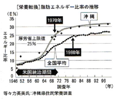 アジアで、米を主食とする文化圏で真っ先に食生活の欧米化が進んだ地域が沖縄で、米軍の統治がもたらしたアメリカの食物・食文化の流入により、若い世代でファストフードや加工食品の摂取量が多くなり、60年代以降脂肪摂取量が急増し、98年には摂取カロリーの31%が脂肪となっています。そして、30~40歳代を中心に肥満が増え、心筋梗塞などが増加しています。 こうした栄養状態の変化と、車を多用し自分で動くことが少なくなったことなどが、沖縄の平均寿命を低下させ、肥満率や、生活習慣病の発症率を上昇させていったようです。