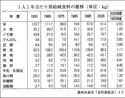 この50年で、国産のお米の消費量はほぼ半減し、朝食にごはん(和食)ではなくパン(洋食)を食べる家庭が増え続けています。同じ様なカロリーでも、ごはん食とパン食では、総エネルギーに対する脂質の占める割合には大きな違いがあること、パン中心のメニューではかなりの高脂肪食となることを、どれだけの人が理解しているのでしょうか。 ごはんは、水分60%で脂質3%ほどですが、トーストパンにバターやマーガリンを加えたものは、水分30%台で脂質は30~40%となり、洋食系のおかずも高脂肪となりやすく、パン&洋食では高脂肪食となってしまうのです。 ![]() 第2次大戦後、乳児死亡率の激減・食料不足の解消・生活環境の向上・医療技術の進歩などで、日本は世界一の長寿国になりました。しかし、ごはん(米)が半減し、肉・乳製品・油脂類が急増した食生活の変化(乱れ)が、日本人の生活習慣病やメタボリック・シンドロームの患者数を増やし、子どもや若者たちの体力の低下や心身の異常などの、大きな原因となっていることに間違いはありません。 ということを決して忘れてはなりません。伝統の良いところを守り、失われつつある日本人のあるべき姿を取り戻し、日本人の健康と環境、そして日本国の未来を守るべきです。 世界は今 地球上の人口が増加し、70億人を超えました。食料の生産はまだ十分あるのに、約10億の人々が、今も飢餓で苦しんでいます。約9億の人々が水不足で困っています。 人間(とくに先進国の人々)の活動が、自然界のバランスを狂わせている今、自分自身の体や歯を守るための生き方・食べ方<木の視点>はもちろん大切ですが、同時に、できるだけまわり(の人、生き物、自然環境など)に迷惑をかけない生き方・食べ方<森の視点>も考えて行動しなければなりません。木を見て森を見ず、はもう通用しないのです。 そして『善循環=自らの健康を増進し、地域の気候・風土を守り、国土を守り、豊かな地球環境を守ることすべてがつながり、持続していくこと』をめざし、「グローバルに考えて、ローカルに行動する」つまり、できるだけ広い視点から状況を判断し、それを身近な日々の行動に反映していくことが大切なのです。 動 物は 他の生き物の生命をいただいて(食べて)生きている 食べ物は、工場などで(加工はできても)人工的にゼロから作ることはできません。自然の生き物の生命をいただくしかないのです。地球上の多様な生き物を守っていくために、食と環境の問題は、別々ではなく、一体となって考えていかなければならないのです。 そのための第一歩は、自分でやればできることは、ほかの誰か・何かにやらせないで=自分以外のエネルギーをできるだけ使わずに=“自分が動くこと”です。 それを“食べること”にあてはめると、“食べもの”は、口の中で、自分のエネルギーを使って、歯と筋肉で咀嚼することでその形を変えること、が生きる基本だということです。咀嚼回数・唾液分泌量を増やしながら嚥下するためにも、加工された状態でなく「もともとの姿のわかる食べものをできるだけ多く食べる」ことが大切なのです。 米は粉食のパンではなく粒食のご飯で、飲み物はノンカロリーの水かお茶が基本で、野菜・果物はできるだけジュースにしない、大きい魚の切り身より小魚全体を食べること、などです。 さらには、「口中調味」~うす味のごはんとしっかりした(だしの)味のついたおかずを、口の中で混ぜ合わせながら食べる~という食べ方が、早食い・おかずの食べ過ぎ=脂質のとりすぎ=を防ぎ、よく噛み、よく味わう食べ方を形成することにつながります。 * 食感の違うものを口の中に入れると、より多くかむようになる! そして、次に大切なことが「衣食住は、近くのものでやりくりすること=地産地消」「気候風土に合った食べ方をすること=旬産旬消・土産土法」です。 のどがかわいたら、近くの水を飲もう! 良質の軟水に恵まれた日本では、地元の水(水道水)を大切に守り使うこと、遠くの水、とくに外国の水などできるだけ使わないことも大事です。ペットボトルの水やお茶は、水道水の何と、200~2000倍も高くつく飲み物なのです。 ************ ![]() 『あと10年で地球を救う12の考え方』(洋泉社)より 何をどのようにして食べればよいのか? ①近くの物を食べること(地産地消)は、経時的な栄養素のロスを抑えることができ、防虫・防腐対策も最低限ですみ、運送にかかるエネルギー消費も少なく、安全で地球環境を汚しにくい食べ方につながり、 ②身近な(風土・気候に合った)やり方で食べること(土産土法)が、自らの体質(遺伝子のタイプ)に合った、歯にも体にも良い食べ方になる ①のみだと農業&環境問題に偏りがちで、①と②つまり産地と方法がセットになることで健康問題もクリアできるのです。 日本では、お米・大豆・植物性発酵食品・魚介類を中心とした食生活が基本です。 身土不ニ・旬産旬消 風土異なれば食もまた異なるのであり、ヒトは、生まれ住んで