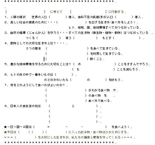 | 歯科からの食育(考え方と伝え方から最新情報まで) 大阪市学校歯科医会 学術部員 豊田 裕章 毎年1回、小学校5年生・6年生に食と環境をテーマに特別授業をする機会があります。その時に、以下のような穴埋め問題を配布し、授業を聞きながら回答を記入してもらい、あとで答え合わせをしています。授業を聞けばわかる問題ばかりなので、ほとんどの子どもたちが正解を記入してくれます ![]() 【解答】 グローバル、ローカル、 食育の考え方について・キーワード&キーセンテンス ・木の視点・森の視点・・・木も森も見る生き方