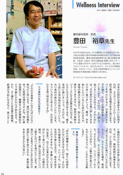ばらんす10月号「ウエルネス・インタビュー」 豊田歯科医院 豊田裕章 先生 自分と地球の健康のために 〜近くのものを食べることから始めよう〜 「食育」という言葉。最近よく聞きますが、「体が喜ぶものを食べる」といったイメージは浮かぶものの、詳しい内容はよくわからないという人が多いのではないでしょうか? 実は「食育基本法」という法律が2005年に制定され、『国民の食生活においては、栄養の偏り、不規則な食事、肥満や生活習慣病の増加、過度の痩身志向などの問題に加え、新たな食の安全上の問題や、食の海外への依存の問題が生じており、食に関する情報が社会に氾濫する中で、人々は、食生活の改善の面からも、食の安全の確保の面からも、自ら食のあり方を学ぶことが求められている』と書かれています。今回は、食育に熱心な大阪の歯科医師、豊田先生にお話を伺いました。 「食育」という言葉がよくメディアで取り上げられていますが、先生が提唱する食育とは? 「食育には色々な考え方があり、それぞれの意味があるでしょうが、私の考える『食育』は、何をどのように食べるかを学ぶことによって、 @丈夫な体を作る、 A思いやりのある豊かな心を育む、 B地球全体のことを考え、多様な生き物、豊かな自然環境を守っていく、 以上の3点を実践できる人を育てることです。1番目と2番目はよく耳にすると思います。人間が自然界のバランスを狂わせている現在では、3番目がとても重要で、地球全体のことを考えて行動する必要があると思います」 難しいですね。もう少し具体的に教えてください。 「私たちは、近くに水や食べ物があるにもかかわらず、あまりにも遠くの水や食べ物を摂りすぎていることを意識したことがありますか? 動物は、自分が食べる物を自分で見つけ、自分で運びますね。人間もできるだけ同じように生きる必要があると思うのです。自分でやればできることを、何かにやらせない、だれかにやらせない。例えば船や飛行機に運ばせないということです。そうすれば、環境への負荷は減りますよね。防虫や防腐対策も最低限で済みます。できるだけ近くのものを、その気候や風土に合った方法で食べることが大切だと思います」 日本で近くのものといえば、例えばお米をもっと食べようということですか? 「皆さんそう思うみたいですが(笑い)、まずは水が一番重要です。なぜなら人間の体の約60%は水分ですから、水が生活や環境に占める割合は非常に大きいのです。皆さんは飲み物をどうされていますか? コンビニやスーパーで購入したペットボトルの水を飲んでいませんか? 外国や日本の遠い場所から空気を汚しながら運んでくる飲み水ですよ。これらは、水道水に比べなんと200から2000倍も高い飲み水なのです。良質な軟水に恵まれた日本に住んでいるのですから、身近な水道水を飲みましょう」 では、食べ物はいかがですか? 「近くで採れる食材といえば、お米ですね。輸入に頼る小麦製品のパンは休日の楽しみにし、ふだんはご飯を食べましょうとお話しています。ご飯を中心に、ご飯に合う味噌やしょう油、鰹節、漬物など、日本の伝統的な食品を大いに利用すれば、メタボリックシンドロームの予防や解消にも効果があると思います。パンを中心にすると、洋食系のおかずが増え、かなりの高脂肪食になってしまいます。それから、よく噛んで食べることも大切です。そのためには、“元の姿のわかる食べ物”をできるだけ多く食べましょう。最近、米を粉にしたパンなども見かけますが、食育の観点から見ると、粉にする必要なんてありません。野菜や果物もジュースにする必要はないのです。私たちには丈夫な歯があります。歯を有効に使いましょう。それから、加工品には添加物が使われていたり、元の食材がわからなかったりします。そういう点から考えても、元の姿のわかる食べ物は安心ですね」 なぜ歯科の先生が食育を? 「だれかが食育をしなければいけない時代だと思います。専門的な知識を持った医師は適任ですよね。特に歯科医院なら、健康な人が定期検診などで年齢にかかわらず訪れます。それに、よく噛むことは虫歯や歯周病、肥満の予防になるなど、食べることと歯科のかかわりは非常に深いのです。だから、歯科医師が食育をするのは、ごく当然のことだと思います。『食べるべきものが食べたいものになるように、子どもたちを導き、育成すること』が、大人の役割だと思います。子どもたちが、ハンバーガーやドーナツではなく、ご飯や魚が食べたいものになるように、これからも活動します」 最期に先生の健康法を教えてください。 「自分の健康よりも、周りに迷惑をかけない生き方を心がける…それが私の健康法です。といっても、日常生活が不便になるので、車を手放すことができません。矛盾していますね(苦笑)。日ごろは身近なものを大切にして食べていますが、日曜日の朝は、家族と一緒に近所のおいしいパン屋さんのパン